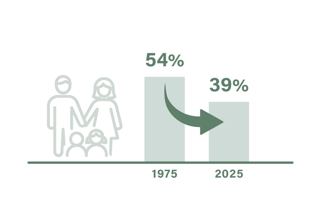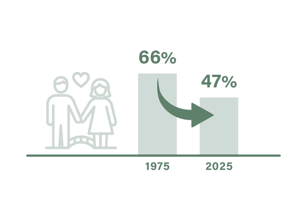2025년 기준, 미국 가구 중 기혼 부부 가구 비율은 47%로, 절반에도 미치지 못했다. 1975년 약 66%였던 것과 비교하면 반세기 만에 크게 줄어든 수치다.