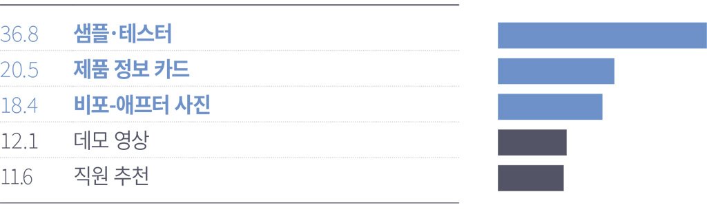고객들은 샘플·테스터와 같은 직접 체험하는 형식을 가장 유용한 쇼핑 정보로 선호했다. 그다음으로 제품 정보 카드, 비포–애프터 사진, 데모 영상, 직원추천 순으로 나타났다.