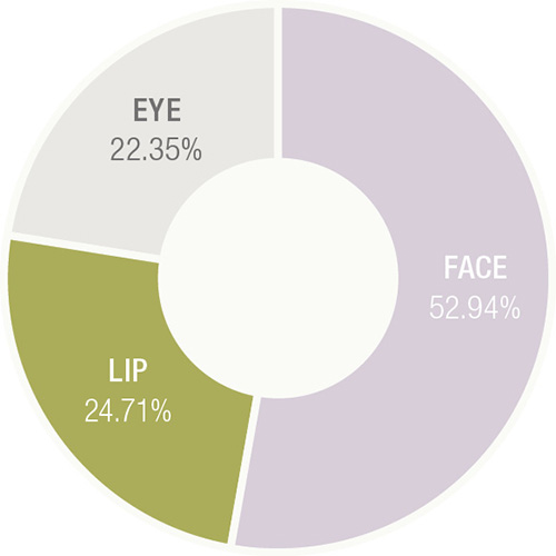메이크업은 이번 봄 가장 큰 관심을 끌고 있는 카테고리로 떠오르고 있다. 그중에서도 52.94%가 파운데이션, 컨실러, 파우더, 블러셔, 컨투어 등 페이스 제품에 집중되고 있다. 이러한 경향은, 2026 봄, 대담한 변화보다는 자연스럽고 정돈된 피부 표현과 그 완성도에 초점이 맞춰져 있음을 보여준다.