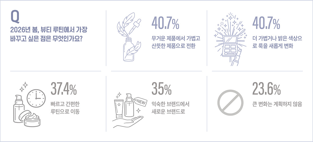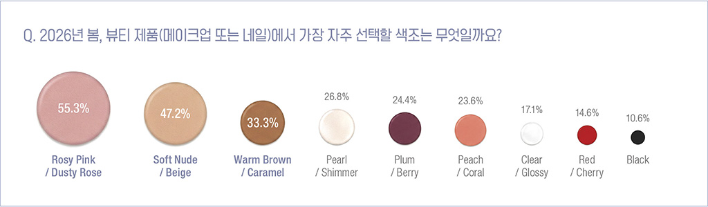 레드(14.63%)와 블랙(10.57%)과 같은 밝고 드라마틱한 색조는 눈에 띄게 낮은 순위를 기록했다. 조사 결과, 2026년 봄 메이크업은 과감한 변신보다는 ‘은은한 리프레시’에 가까운 트렌드를 보인다. 고객들은 새로운 룩을 시도하기 보다는 일상에서 부담 없이 사용할 수 있는 컬러를 선호하고 있다.