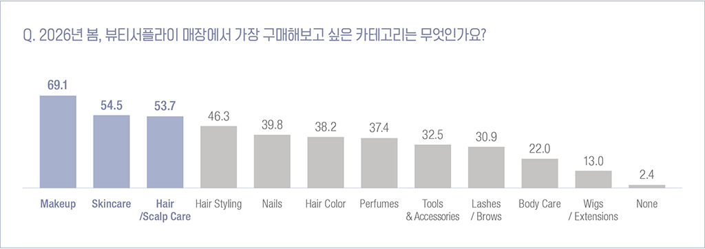 2026년 봄, 뷰티서플라이 고객들은 단순히 재구매에 그치지 않고, 새로운 변화를 찾고 있다. 최근 뷰티서플라이 정기 이용자 108명을 대상으로 한 설문조사에 따르면, 소비자들은 모든 카테고리에서 적극적인 변화를 추구하고 있는 것으로 나타났다. 이는 이번 시즌 매장 운영에 있어 어떤 어떤 제품군에 집중하고, 어떤 메시지로 소통하며, 어떻게 진열 전략을 가져가야 할지에 대한 분명한 방향성을 제시한다.