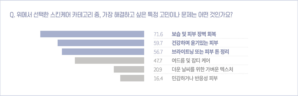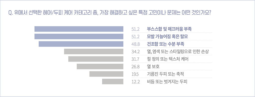 헤어 및 두피 케어는 이번 봄에도 기본적인 카테고리로 자리잡고 있지만, 우선순위는 관리와 헤어 건강으로 이동하고 있음을 보여준다. 손상된 헤어 복구, 컬 정의, 열 보호가 그 뒤를 잇고 있으며, 전통적인 비듬 케어는 상당히 낮은 관심을 보였다.