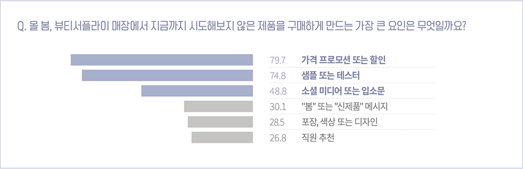 데이터에 따르면, 신제품 구매를 유도하는 가장 강력한 요인은 가격 할인과 프로모션이며, 그 뒤를 직원 추천이 차지하고 있다. 이는 뷰티서플라이 채널의 강점인 소비자와의 개인적인 소통이 여전히 유효하다는 것을 보여준다. “신상품” 이나 “봄 상품” 과 같은 포장 및 테스터 운영도 영향을 미치지만, 소비자에게는 가격 안정감과 전문적인 안내가 여전히 신뢰를 구축하는 주요 요소 작용한다. 이는 소비자들이 신제품 체험을 꺼리는 것이 아니라, 단지 리스크를 최소화하고 싶어 한다는 것을 뜻한다.