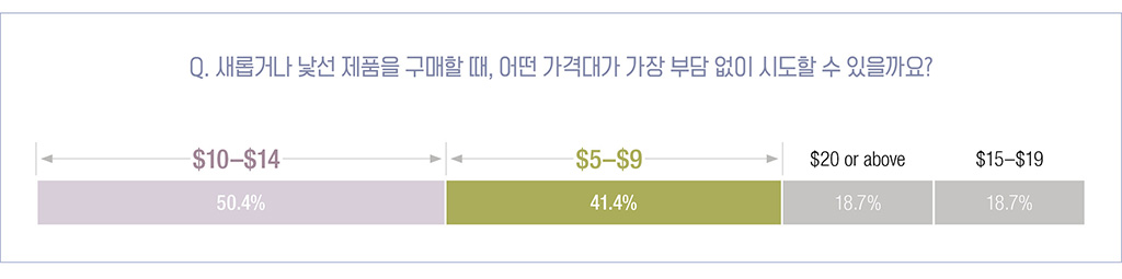 $10–14 가격대는 새로운 SKU를 도입을 위한 전략적인 적정 구간으로, 시즌별 메세지와 함께 신규 SKU를 $15이하로 출시하면 체험을 유도한 가능성이 크게 증가한다. |
