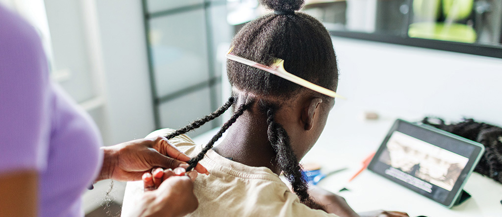 Young black woman working at home and making afro braids to young black men