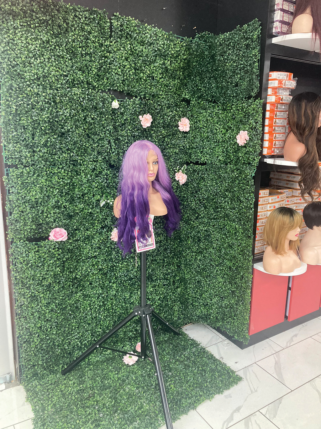 A retail store in Dallas features a themed “Wig of the Month” section to attract customers. The backdrop enhances the store’s social media appeal and promotional impact.