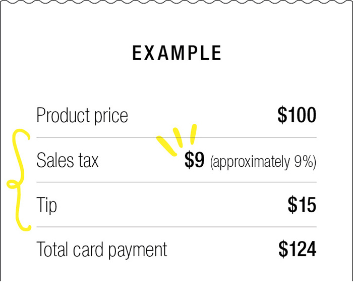 At a 3 percent processing rate, the store would pay $3.72 in fees. Of that total, $24 representing sales tax and tip is not actual store revenue.