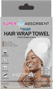 H2pro Super Absorbent Hair Wrap Towel Made from soft, super-absorbent microfiber material, this towel quickly absorbs water to speed up drying time. It protects hair by reducing friction and remains durable without discoloring. The generous size makes it suitable for all hair types.