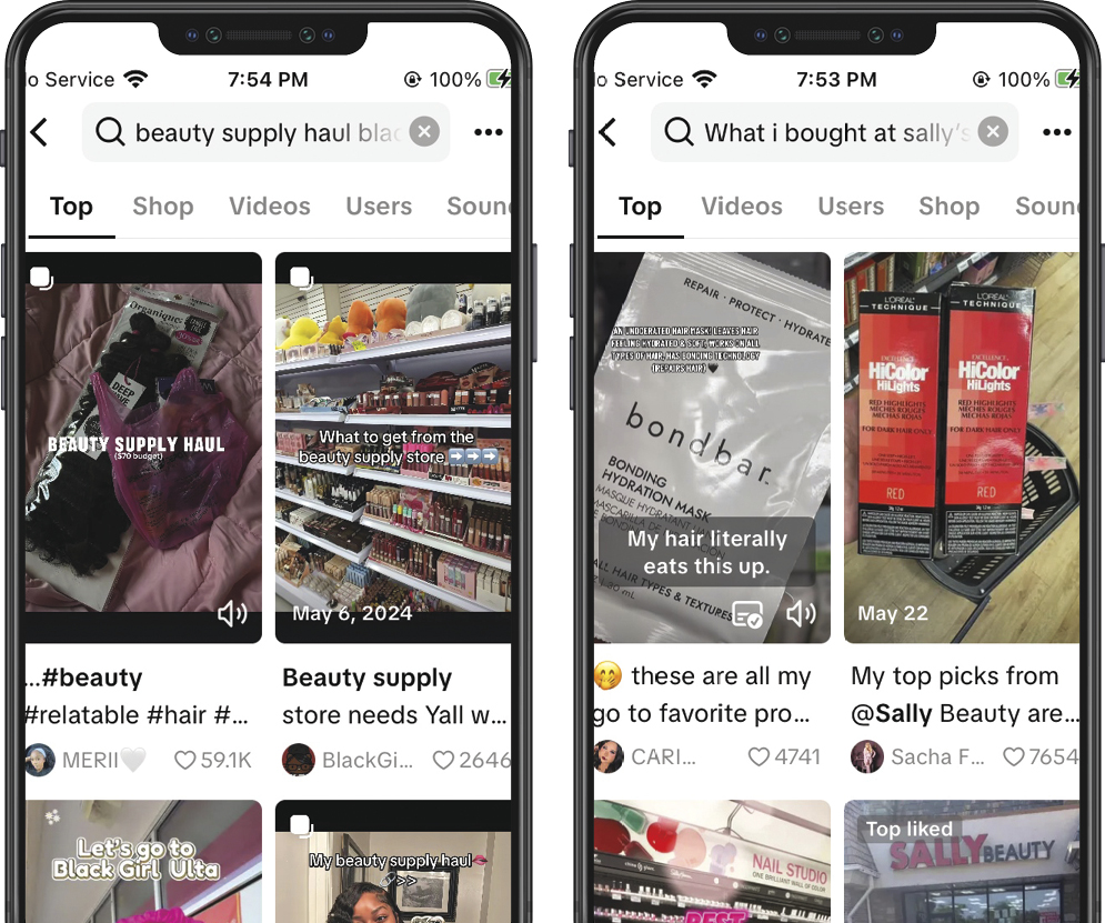 TikTok search screen example. Entering keywords like ‘Beauty Supply Haul Black Girls’ or ‘What I bought at Sally’s’ reveals content featuring products frequently purchased by users.